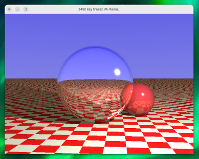 Ray tracer on a business card1. vi card.cpp 2. Copy and paste the code below. 3. g++ card.cpp -lm -o card 4. ./card > image.ppm 5. display image.ppm --------------------------------------- #include <stdlib.h> // card > aek.ppm #include <stdio.h> #include <math.h> typedef int i;typedef float f;struct v{ f x,y,z;v operator+(v r){return v(x+r.x ,y+r.y,z+r.z);}v operator*(f r){return v(x*r,y*r,z*r);}f operator%(v r){return x*r.x+y*r.y+z*r.z;}v(){}v operator^(v r ){return v(y*r.z-z*r.y,z*r.x-x*r.z,x*r. y-y*r.x);}v(f a,f b,f c){x=a;y=b;z=c;}v operator!(){return*this*(1/sqrt(*this%* this));}};i G[]={247570,280596,280600, 249748,18578,18577,231184,16,16};f R(){ return(f)rand()/RAND_MAX;}i T(v o,v d,f &t,v&n){t=1e9;i m=0;f p=-o.z/d.z;if(.01 <p)t=p,n=v(0,0,1),m=1;for(i k=19;k--;) for(i j=9;j--;)if(G[j]&1<<k){v p=o+v(-k ,0,-j-4);f b=p%d,c=p%p-1,q=b*b-c;if(q>0 ){f s=-b-sqrt(q);if(s<t&&s>.01)t=s,n=!( p+d*t),m=2;}}return m;}v S(v o,v d){f t ;v n;i m=T(o,d,t,n);if(!m)return v(.7, .6,1)*pow(1-d.z,4);v h=o+d*t,l=!(v(9+R( ),9+R(),16)+h*-1),r=d+n*(n%d*-2);f b=l% n;if(b<0||T(h,l,t,n))b=0;f p=pow(l%r*(b >0),99);if(m&1){h=h*.2;return((i)(ceil( h.x)+ceil(h.y))&1?v(3,1,1):v(3,3,3))*(b *.2+.1);}return v(p,p,p)+S(h,r)*.5;}i main(){printf("P6 512 512 255 ");v g=!v (-6,-16,0),a=!(v(0,0,1)^g)*.002,b=!(g^a )*.002,c=(a+b)*-256+g;for(i y=512;y--;) for(i x=512;x--;){v p(13,13,13);for(i r =64;r--;){v t=a*(R()-.5)*99+b*(R()-.5)* 99;p=S(v(17,16,8)+t,!(t*-1+(a*(R()+x)+b *(y+R())+c)*16))*3.5+p;}printf("%c%c%c" ,(i)p.x,(i)p.y,(i)p.z);}} --------------------------------------- Reference https://fabiensanglard.net/revisiting_the_businesscard_raytracer/------------------------------ For transparent objects... ------------------------------ Image from code below...Try to achieve this image... Code for the sky is shown below.