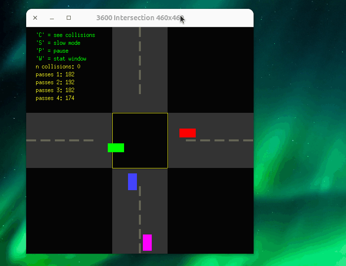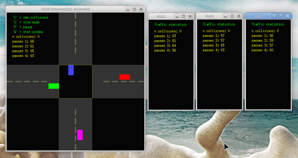 CMPS-3600 - Fall 2025 - Semester ProjectPhase-4 - Show passes and collisions in a child window ------------------------------------------------------ Start with your bblab9.c program. Name your program: 3600/f/bbphase4.c You may move all project phases to Odin directory 3600/f $ cd 3600/f $ cp ../4/myxwindow.c . $ cp ../6/bbphase2.c . $ cp ../9/bbphase3.c . $ cp ../9/bblab9.c bbphase4.c Compile like this... gcc bbphase4.c -Wall -lX11 -lXext -pthreadWhat to do... 1. Press 'W' to get a child window. ----------------------------------- The child will show the statistics for each car. Show the passes for each car. Show the total number of collisions. 2. In the parent window, add a feature to pause the action. ----------------------------------------------------------- Now we can easily see the statistics. 3. If the parent window is moved, the child follows. ---------------------------------------------------- See the animation. 4. Inter process communication. ------------------------------- Use a System-V message queue to send the child the data. You may also use a pipe. recommended: Use a message queue to send car data. Use a pipe to send the parent window position when it moves. When a car passes through the intersection, send a message to the child updating that one car. Tips: Your child process should be the bbphase4.c executable, but without... - the cars - the intersection graphics - the car thread You cannot run the car thread inside your child process. Pass these things to the child on the command-line... - message-queue ID - pipe file descriptors Allow multiple child windows. See the code below for child window movement. Please allow for multiple child windows.