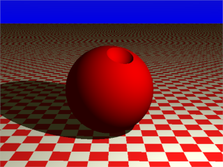 Show your images on an Odin web page at: public_html/3480/lab7.htmlLab-8 code from Wednesday for dent in sphere------------------------------- structs... ------------------------------- struct Clip { Vec center; Vec normal; Flt radius; int inside; Clip() { radius = 0.0; inside = 1; } }; struct Object { int type; int inside; Vec center; Vec norm; Vec tri[3]; Flt radius, radius2; Vec color; int surface; bool specular; Vec spec; Clip clip; int nclips; Object() { nclips = 0; inside = 0; } }; ------------------------------- function... ------------------------------- void vecNegate(Vec v) { v[0] = -v[0]; v[1] = -v[1]; v[2] = -v[2]; } ------------------------------- from init()... ------------------------------- //big ball o = &g.object[g.nobjects]; o->type = TYPE_SPHERE; vecMake(0.0, 200.0, 0.0, o->center); vecMake(1.0, 0.0, 0.0, o->color); o->radius = 200.0; o->specular = true; o->specular = 0; vecMake(0.3, 0.3, 0.3, o->spec); o->surface = SURF_NONE; //add a clip vecMake(50.0, 380.0, 90.0, o->clip.center); o->clip.radius = 60.0; ++o->nclips; g.nobjects++; // //small ball for dent o = &g.object[g.nobjects]; o->type = TYPE_SPHERE; vecMake(50.0, 380.0, 90.0, o->center); vecMake(1.0, 0.0, 0.0, o->color); o->radius = 60.0; o->specular = true; o->specular = 0; vecMake(0.3, 0.3, 0.3, o->spec); o->surface = SURF_NONE; o->inside = 1; //add a clip vecMake(0.0, 200.0, 0.0, o->clip.center); o->clip.radius = 200.0; o->clip.inside = 0; ++o->nclips; g.nobjects++; ------------------------------- from raySphereIntersect()... ------------------------------- if (t0 > 0.0) { hit->p[0] = ray->o[0] + ray->d[0] * t0; hit->p[1] = ray->o[1] + ray->d[1] * t0; hit->p[2] = ray->o[2] + ray->d[2] * t0; sphereNormal(hit->p, o->center, hit->norm); //if (o->inside) // vecNegate(hit->norm); hit->t = t0; if (o->nclips > 0) { if (o->clip.radius != 0.0) { //clipping sphere Vec v; vecSub(o->clip.center, hit->p, v); Flt dist = sqrt(v[0]*v[0] + v[1]*v[1] + v[2]*v[2]); if (o->clip.inside) { if (dist <= o->clip.radius) goto t1; } else { if (dist >= o->clip.radius) goto t1; } } } return 1; } t1:; if (t1 > 0.0) { hit->p[0] = ray->o[0] + ray->d[0] * t1; hit->p[1] = ray->o[1] + ray->d[1] * t1; hit->p[2] = ray->o[2] + ray->d[2] * t1; sphereNormal(hit->p, o->center, hit->norm); //if (o->inside) // vecNegate(hit->norm); hit->t = t1; if (o->nclips > 0) { if (o->clip.radius != 0.0) { //clipping sphere Vec v; vecSub(o->clip.center, hit->p, v); Flt dist = sqrt(v[0]*v[0] + v[1]*v[1] + v[2]*v[2]); if (o->clip.inside) { if (dist <= o->clip.radius) return 0; } else { if (dist >= o->clip.radius) return 0; } } } return 1; } ------------------------------- from trace()... ------------------------------- case TYPE_SPHERE: if (raySphereIntersect(o, ray, &hit)) { if (hit.t < closehit.t) { closehit.t = hit.t; vecCopy(hit.p, closehit.p); vecCopy(o->color, closehit.color); sphereNormal(closehit.p, o->center, closehit.norm); if (o->inside) vecNegate(closehit.norm); h = i; } } break; ------------------------------- spherical texture... -------------------------------