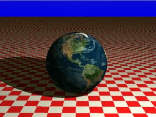 Name your texture image file: lab8a.png //This goes inside the trace() function if (o->surface == SURF_SPHERICAL_TEXTURE) { //Get the spherical texture color based on the hit-point normal. //Must have Image class from lab-1. // const Flt PI = 3.14159265358979; const Flt PIdiv2 = PI / 2.0; const Flt PItimes2 = PI * 2.0; Vec vn; vecCopy(closehit.norm, vn); //Use normal.y to get an angle Flt pct = asin(vn[1]) / PIdiv2; //pct might be positive or negative Flt h2 = (Flt)img.height * 0.5; //Get the row in the image stream Flt row = h2 + (pct * h2); //Get the angle of hitpoint going around the sphere Flt col_angle = atan2(vn[2], vn[0]); //Use angle to get the column in the image stream Flt col = ((col_angle + PI) / PItimes2) * (Flt)img.width; //flip y and x coordinates row = img.height - row - 1; col = img.width - col - 1; //Get row and column to use in pointer arithmetic int y = (int)row; int x = (int)col; //Get the spot within the image stream int spot = y * img.width * 3 + x * 3; //Get pointer to the pixel stream. unsigned char *p = img.data; //Get the red, green, blue colors. closehit.color[0] = (Flt)(*(p + (spot + 0))) / 255.0; closehit.color[1] = (Flt)(*(p + (spot + 1))) / 255.0; closehit.color[2] = (Flt)(*(p + (spot + 2))) / 255.0; }