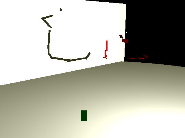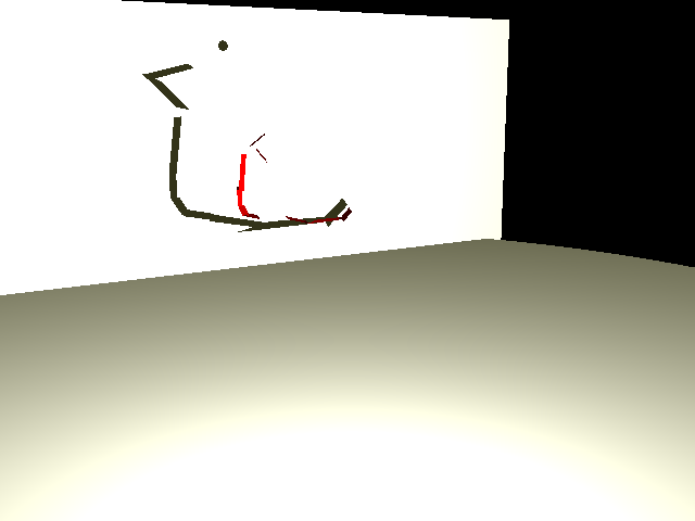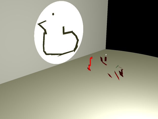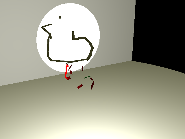 The perspective will be at an angle like in the image above it will have a small floor and wall acting as a background and canvas for shadows. Abstract shapes will be placed and suspended in the air adjacent to the wall, behind the camera will be some diffuse lighting that will shine on the abstract shapes making the image of a chicken in simplistic fashion. There will also be slight animation of the camera moving, not much movement but enough to show that from a specific angle the shadows make an image and from another it doesn't.
